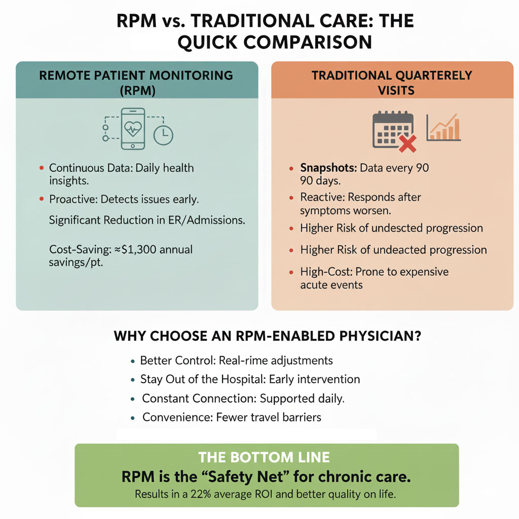 Conclusion: When managing chronic conditions, connected care through RPM enhances physician oversight, strengthens patient engagement, and improves clinical and economic outcomes compared with traditional episodic care alone. Patients seeking optimal long-term management should strongly consider practices that integrate remote monitoring into their care model.